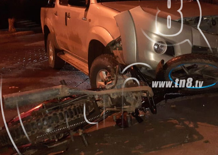 A eso de las 10:30 de la noche de este pasado viernes se produjo un fuerte accidente de tránsito, propiamente contiguo a la empresa de cable Americable, que dejó al joven Heliodoro Reyes Rocha de 32 años con lesiones de consideración en diferentes partes del cuerpo al momento que este conducía su motocicleta marca Platino placa CT 10384 contra la vía siendo impactado a un costado por una camioneta Hilux placa CT 10563 conducida por el joven Marcos Antonio Tellez Miranda de 16 años originario de Juigalpa.