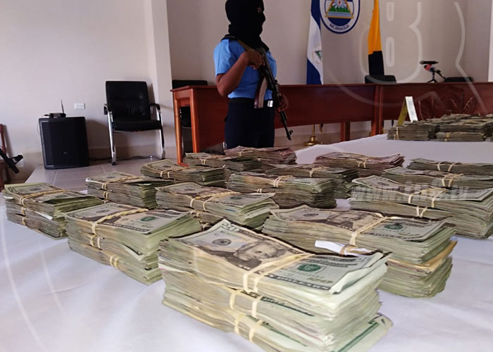 "11 paquetes con dinero contabilizando 249 mil 960 dólares le fueron ocupados en Nueva Segovia al sujeto Ernesto Lenin Zúniga Duarte de 30 años", explicó el comisionado general Luis Pérez olivas, jefe de la Dirección de Auxilio Judicial.