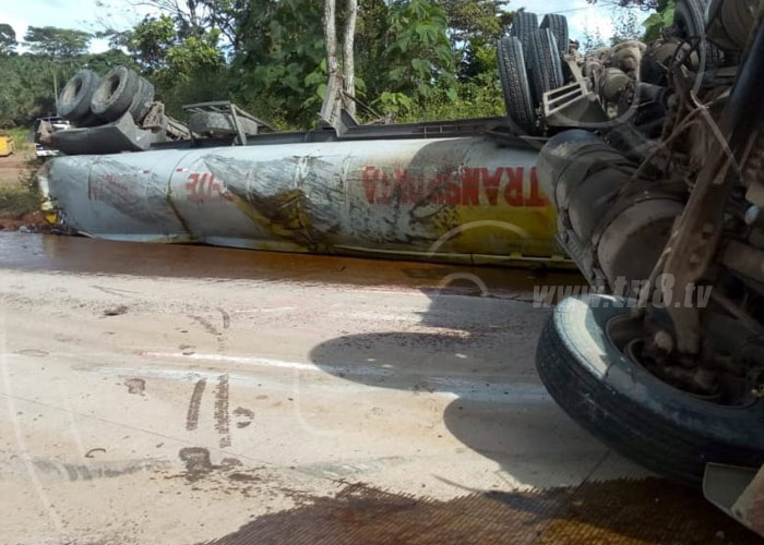 El cabezal junto a la cisterna que halaba quedaron volcados a un lado de la carretera derramando el aceite que transportaba hacia el Pacífico del país para ser procesado, mientras las dos partes del chapulín al lado contrario.