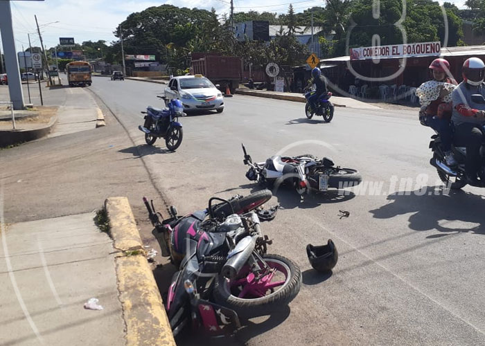 En horas de la tarde de este lunes dos personas resultaron con lesiones en diferentes partes del cuerpo producto del fuerte encontronazo entre dos motocicletas, en las cercanías de la gasolinera UNO Asunción, en la ciudad de Juigalpa, departamento de Chontales.