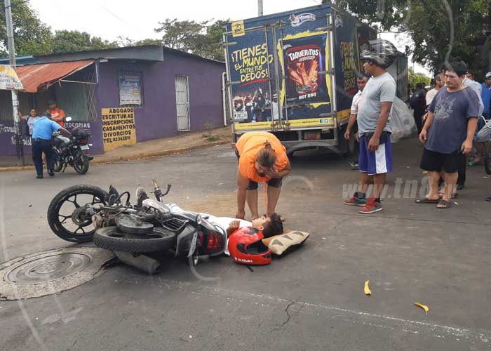 Sobre el pavimento, con golpes en el cuerpo y heridas en el rostro, resultó Marcos Yahir Álvarez de 18 años, al ser impactado este martes por un camioncito repartidor de productos, conducido por José Daniel Casco, en el sector de San Judas, Managua.