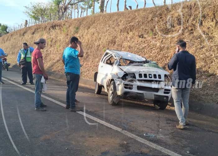 “María Gabriela Solórzano presenta una contusión cervical, esta viajaba como acompañante de Maynor López Luna de 26 años, quien presenta trauma de brazo izquierdo, ambos originarios de Granada, el evento se da a las 4: 00 Pm, cuando viajaban en un vehículo jeep, se les explotó una de las llantas y se volcaron. Ambos en condición estable son remitidos del Hospital Amistad Japón Nicaragua al Hospital Militar en Managua, en donde son asegurados”, aseguró Rudy Muñoz del Benemérito Cuerpo de Bomberos.