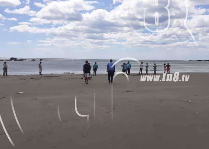 Agentes de la policía se hicieron presentes al lugar tras el aviso de veraneantes que reportaron el hallazgo del cuerpo del joven en la costa entre El Tamarindo y Huehuete.
