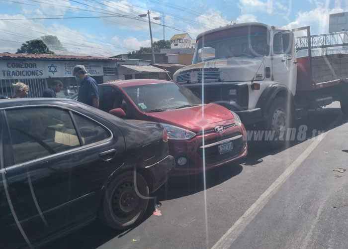 En los semáforos de La Subasta, en Managua, se registró este jueves una colisión entre cinco vehículos y resultó lesionado un limpiavidriosfalta de frenos de un camión.