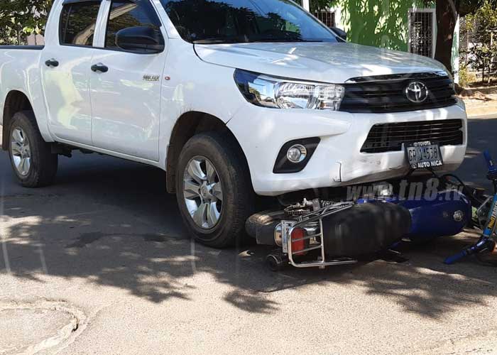 El motociclista Domingo Jarquín y su acompañante, un menor de edad, resultaron con golpes y excoriaciones tras ser impactados por la camioneta conducida por Jairo Peña, quien irrespetó la señal de Alto en el barrio San José, en el Distrito II de Managua.