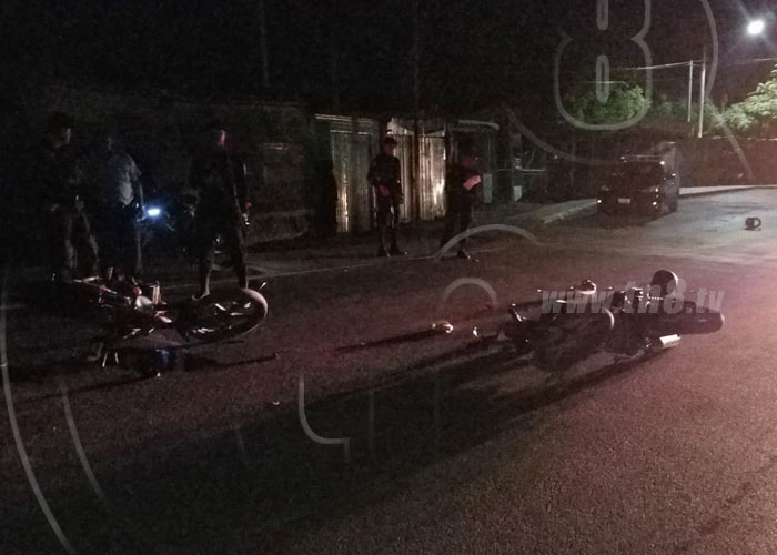 La madrugada de este miércoles 1 de abril, dos personas resultaron con excoriaciones, heridas y golpes en diferentes partes del cuerpo a consecuencia del choque entre dos motocicletas frente al monumento Chaco de D'Leo, kilómetro 141 sobre la carretera que conduce Juigalpa hacia El Rama.