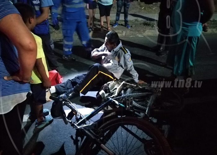 Un guarda de seguridad que se movilizaba en una bicicleta con dirección a su vivienda después de una jornada laboral fue impactado en la parte trasera del vehículo por una pareja de motociclista, que supuestamente circulaban a exceso de velocidad, en estado de ebriedad y no guardaron la distancia, provocando el percance vial, el suceso se registró de los semáforos del Memorial Sandino 300 metros al este.
