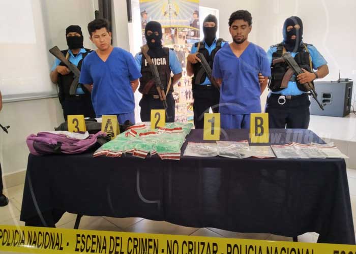 La Policía Nacional presentó este lunes en la mañana desde la Dirección de Auxilio Judicial Nacional, en el complejo Evaristo Vásquez, en Managua, a dos capturados por tráfico de droga en la zona del Caribe Norte de Nicaragua.