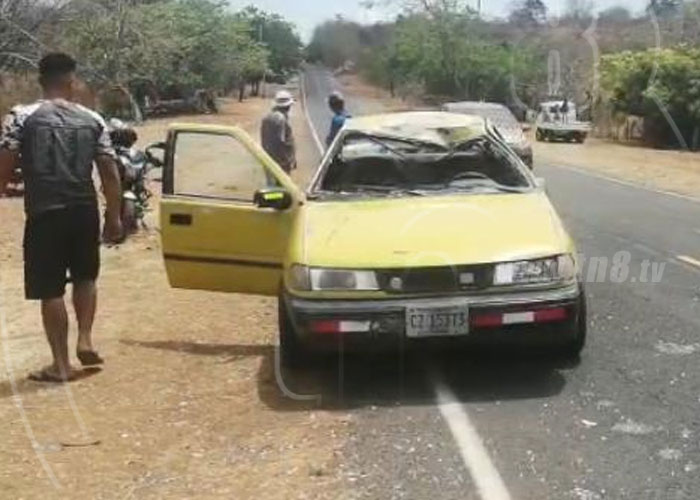 Iba de Diriamba hacia el Río La Flor a visitar a un pastor al que le llevaba de obsequio un pastel por su cumpleaños, cuando el equino color blanco se ls cruzó en la vía, pero fue difícil esquivarlo por lo que impactó y éste destruyó el vidrio delantero del carrito.