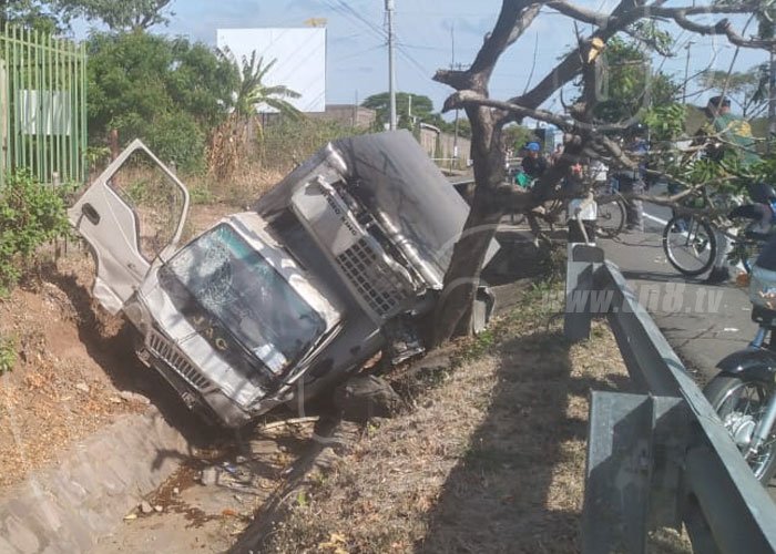 La mañana de este lunes 4 de mayo en la Rotonda al Reparto San Juan, en la entrada a la ciudad de Granada, se registró un accidente de tránsito en que un camión que transportaba carnes se precipitó a un cauce luego de una ponchadura de llanta, que provocó que el conductor del vehículo perdiera el control, suscitándose la escena.