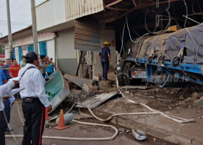 El pesado vehículo con placa guatemalteca además terminó estrellándose contra las instalaciones del banco Lafise Bancentro de este municipio. El accidente se da exactamente en el kilómetro 64.5 de la Carretera Panamericana Sur.