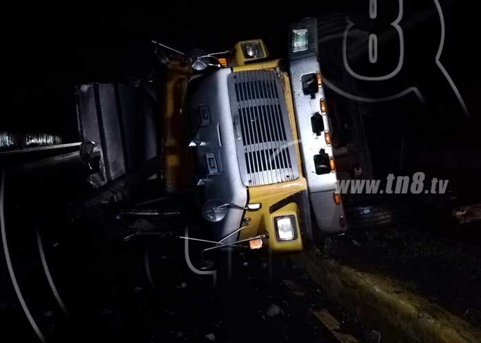De milagro salieron ilesos las tres personas que viajaban a bordo de un camión con dirección Masaya a Managua, tras accidentarse en el km 16.8 de esta peligrosa carretera, al parecer por esquivar a otro vehículo, el conductor del camión perdió el control y acabó volcado en medio de la pista.