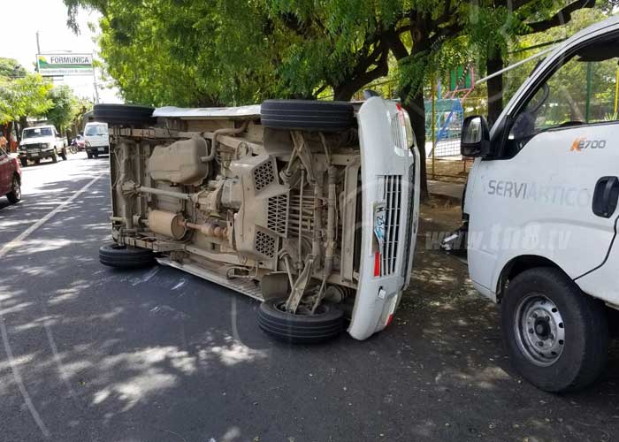 La imprudencia de un conductor, provocó el vuelco de un microbús y el impacto con un camión en el sector de Bolonia este lunes, afortunadamente en el trágico suceso sólo resultaron daños materiales.