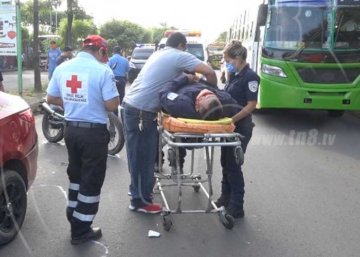A emergencia de un centro hospitalario era trasladado por miembros de la Dirección General de Bomberos, el motociclista Wilmer Castillo de 39 años, al resultar seriamente lesionado tras impactar en la parte trasera de un vehículo taxi este lunes en Managua.