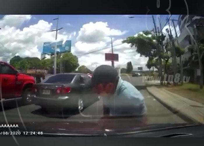 En un video enviado a nuestra línea de WhatsApp 7832-0088 se observa que el conductor de un vehículo circula de manera habitual y tranquila por una vía principal de la Colonia Centroamérica en Managua, cuando repentinamente un hombre imprudentemente intenta cruzar la carretera.
