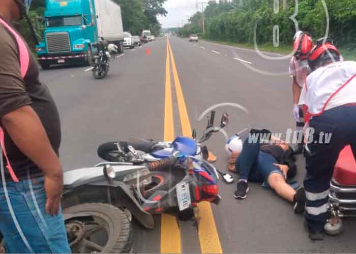 La lesionada fue identificada como Johana, fue trasladada hacia el hospital regional Santiago de Jinotepe, con una posible fractura cerrada en su pierna izquierda, tras caer al pavimento cuando la motocicleta en la que viajaba de acompañante fuese impactada por otra en la parte trasera.
