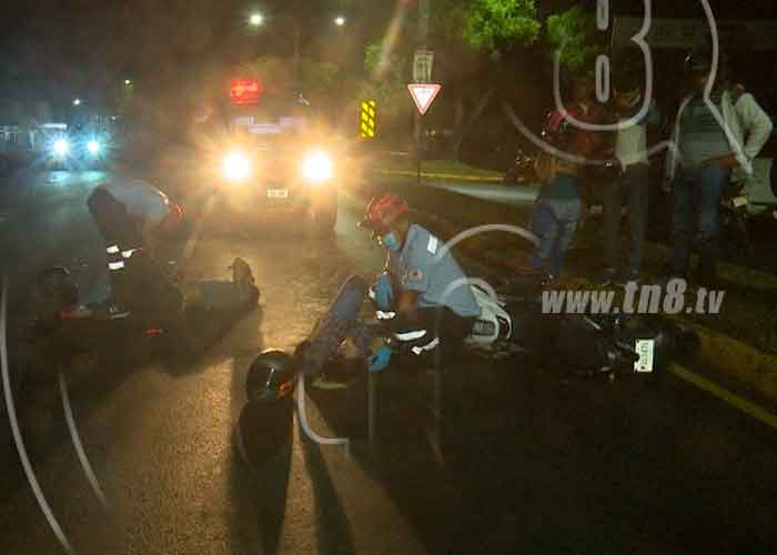 Un motociclista y su acompañante resultaron con fracturas expuestas en sus piernas, luego que colisionaran contra un automóvil en el kilómetro 13 de la carretera a Masaya, tras el accidente la conductora del vehículo intentó darse a la fuga, sin embargo fue detenida a las pocas cuadras.