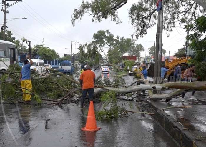 La tarde de este viernes 21 de agosto se registró un incidente propiamente en frente de la Dirección de Tránsito Nacional, ubicada en el Distrito V de Managua, donde producto de las lluvias que se han registrado en las últimas horas en el país, se desprendió de un árbol de eucalipto una rama que medía entre 10 a 12 metros de largo.
