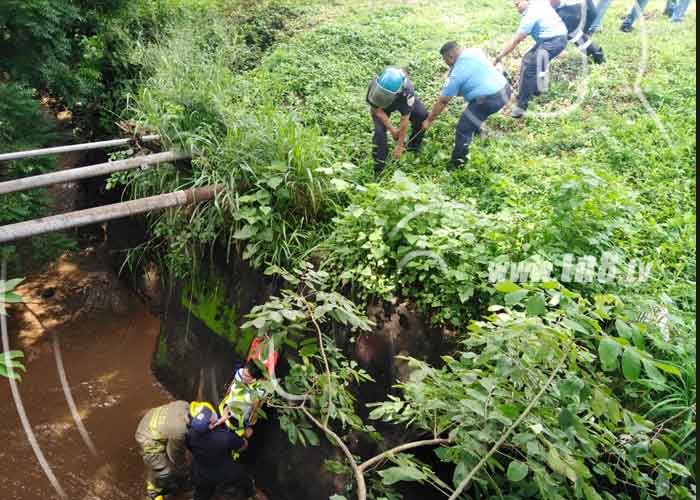 Bomberos de la Dirección General junto a técnicos de Cruz Roja Nicaragüenses, realizaron labores de rescate, para sacar a una mujer que se precipitó a un cauce de aproximadamente tres metros de profundidad este jueves en el barrio Sol de Libertad, en Managua.