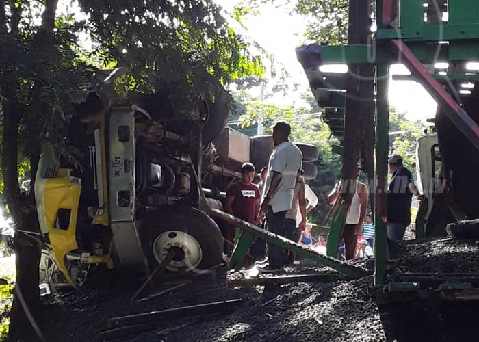 El accidente de tránsito se dio este viernes cuando un camión marca Volvo venía desde Matiguás cargado de piedrín y piedra cantera, pero en la bajada impactó por la parte del camastro o trasera al camión Freightliner cargado de ganado con destino hacia Managua.
