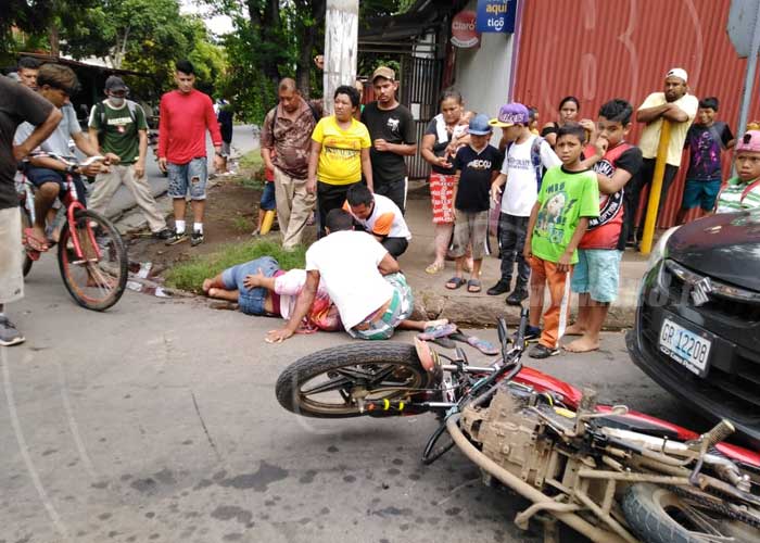 Con fracturas en sus extremidades inferiores terminó una pareja de motociclistas al ser impactados por un vehículo en la famosa intersección conocida como La Cachorra, en el barrio 19 de Julio, la tarde de este miércoles 7 de octubre.
