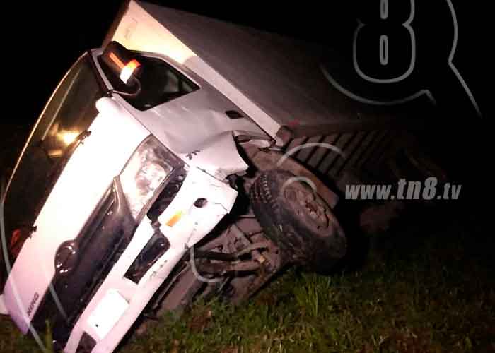 La noche de este martes 13 de octubre a 11 kilómetros antes de llegar a Bluefields el conductor de un camión color blanco, marca Hino placas M 302 749, quedó volcado a un lado de la carretera.