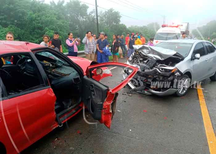 Según versión de testigos el accidente se produjo cuando el conductor del vehículo rojo pretendía aventajar, colisionado de manera frontal contra el carro plateado que circulaba de Managua hacia León.