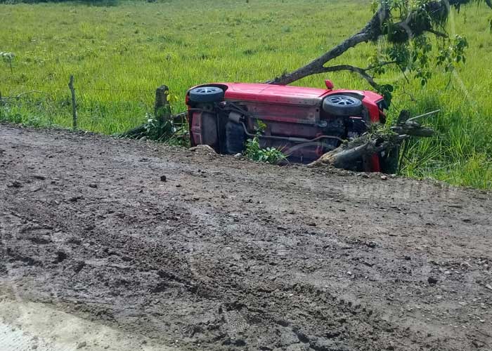 Se registró accidente de tránsito en la entrada al municipio de Matiguás frente al mercado, donde un carrito color rojo con placa MT 34554 por esquivar una piedra se precipitó en la alcantarilla, donde se está construyendo la carretera y terminó dándose vuelta.