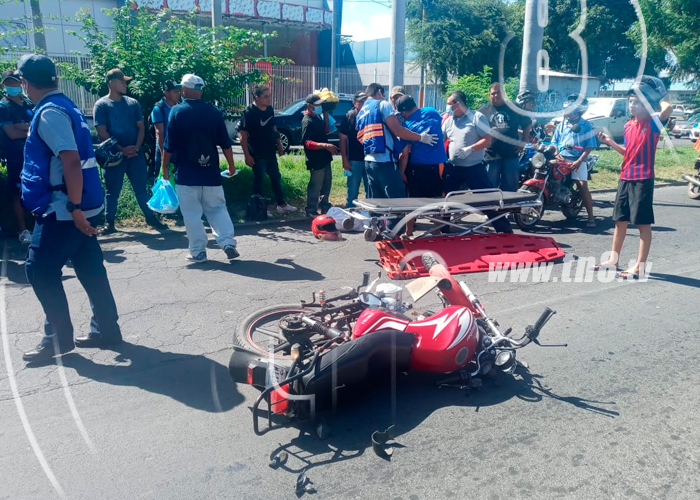 El peatón presentaba un trauma en el pie derecho, una herida en la cabeza más golpes en diversas partes del cuerpo, mientras el motociclista presentaba quemaduras por fricción en el brazo y la pierna derecha más posible fractura de clavícula, ambos fueron asistidos y trasladados en diferentes unidades de la central de ambulancia del Ministerio de Salud, MINSA, al hospital Alemán Nicaragüense.