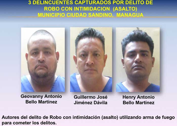 3 sujetos fueron arrestados por el delito de robo con intimidación en el municipio de Ciudad Sandino: Geovanny Antonio Bello Martínez, Guillermo José Jiménez Dávila y Henry Antonio Bello Martínez, los cuales para cometer asaltos supuestamente utilizaron armas de fuego.