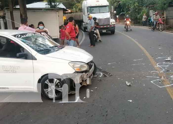 Fuerte accidente de tránsito en el barrio Hernán Cruz en la ciudad de Boaco, exactamente en el km 90 carretera Boaco-Managua, donde un taxi color blanco marca Toyota Yaris placa BO 034 chocó en la llanta trasera del camión color blanco marca freightliner placa MT 32584, que se desplazaba de en dirección contraria conducido por José Gonzáles Dávila originario de Matagalpa.