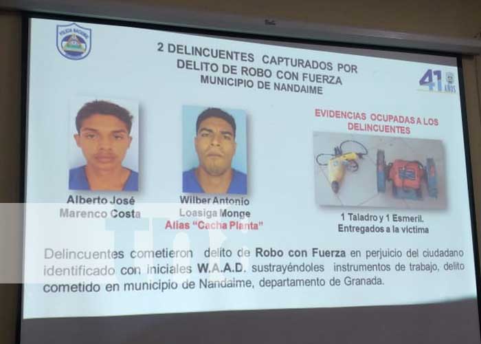 En el delito de robo con fuerza fueron detenidos Alberto José Marenco y Wilber Antonio Loáisiga, alias “Cacha Planta”, por sustraer instrumentos de trabajo en una vivienda en el municipio Nandaime y en el robo con violencia fue detenido José Leonardo Martínez, alias “Lulú”, por el robo de celulares en el reparto San Ignacio en Granada.
