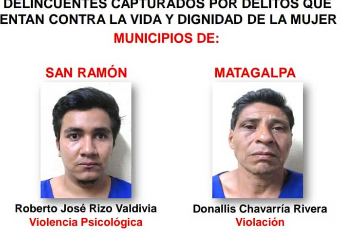 En cumplimiento a la campaña de protección a las mujeres; se capturó a dos personas, Roberto José Rizo, señalado de violencia psicológica y Donallis Chavarría Rivera por violación.