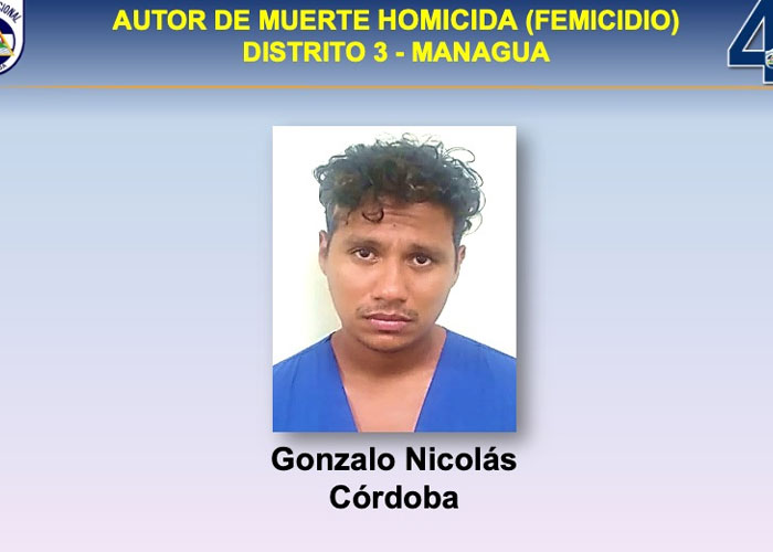 «Autor de muerte homicida (femicidio), Distrito 3 – Managua, Gonzalo Nicolás Córdoba, en perjuicio de Ana del Pilar Umaña Romero, (q.e.p.d.), delito cometido el día sábado 25 de noviembre del 2023, en el barrio Altagracia Sur, Distrito 3. Móvil del hecho: Discordia entre pareja»; afirmó la comisionada general Vilma González, directora de la Co-Jefatura de relaciones públicas de la Policía Nacional.