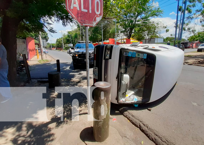 En una de las calles principales del barrio 19 de Julio, en Managua, se produjo un violento accidente de tránsito que provocó el vuelco de un microbús.