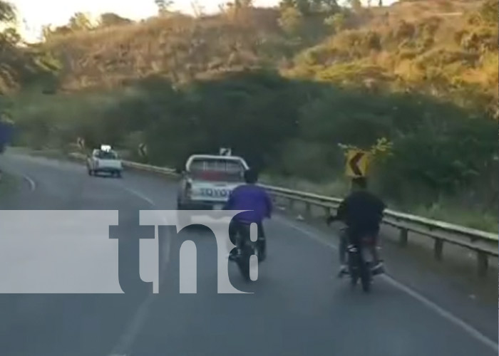 Este martes, a través de un video recibido en la línea de WhatsApp de Canal 8, se muestra a dos jóvenes circulando a alta velocidad en motocicletas sin placas de identificación, en la carretera Cardones, Las Palomas; en Matagalpa.