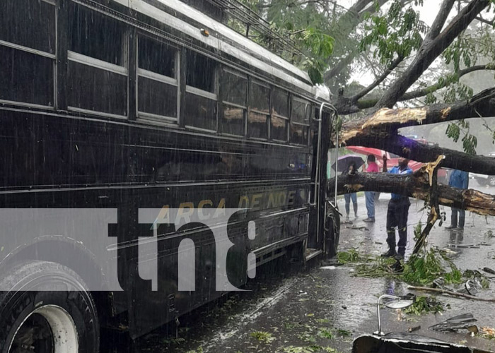 Un árbol cayó sobre un bus de transporte colectivo en la entrada al municipio de El Realejo, en el departamento de Chinandega. Información preliminar reporta a un pasajero de la tercera edad lesionado, quien tuvo que ser trasladado al hospital departamental Doctor Mauricio Abdalah.