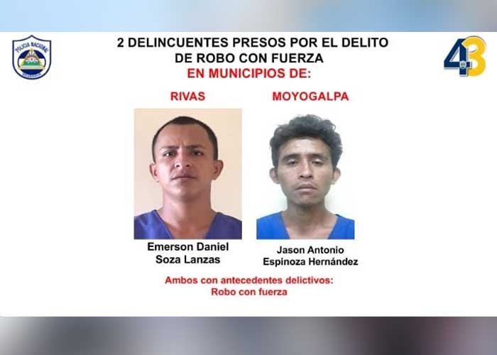 En Rivas, se detuvo a dos personas por el supuesto delito de robo con violencia; dos por presuntamente dedicarse a cometer robo fuerza; tres por aparentemente cometer el delito de abastecedores de drogas y uno por abigeato.