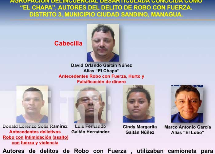 «Agrupación delincuencial desarticulada conocida como ‘La Chapa’, autores del delito de robo con fuerza en el Distrito III, Ciudad Sandino y Managua. Fueron detenidos el cabecilla David Orlando Gaitán Núñez, alias El Chapa, quien tiene antecedentes robo con fuerza, hurto y falsificación de dinero»; dijo el comisionado general Sergio Gutiérrez, segundo jefe policial de Managua.