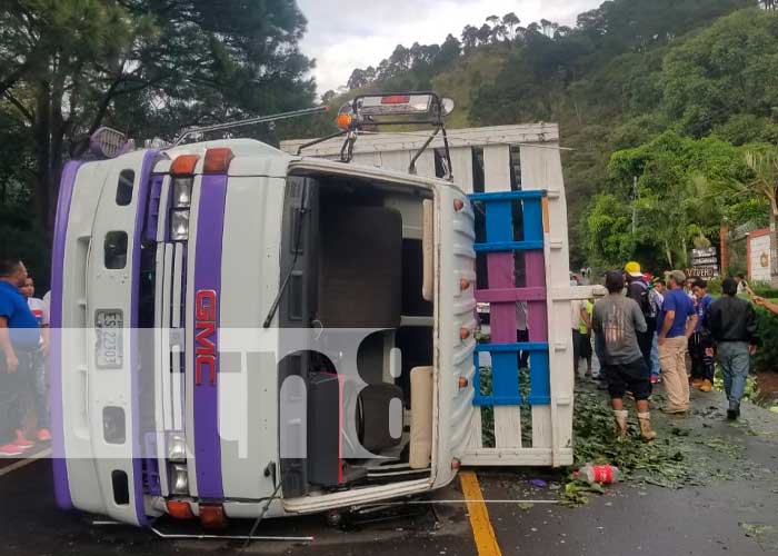 Volcado de costado y con la carga esparcida sobre la via quedó el camión conducido por Victorino Rizo Blandón; ya que supuestamente el pesado automotor presentara fallas mecánicas al bajar una pendiente en el sector conocido como Los Lipes, en las cercanías al kilómetro 135 de la carretera que conecta a las municipios de Matagalpa y Jinotega.
