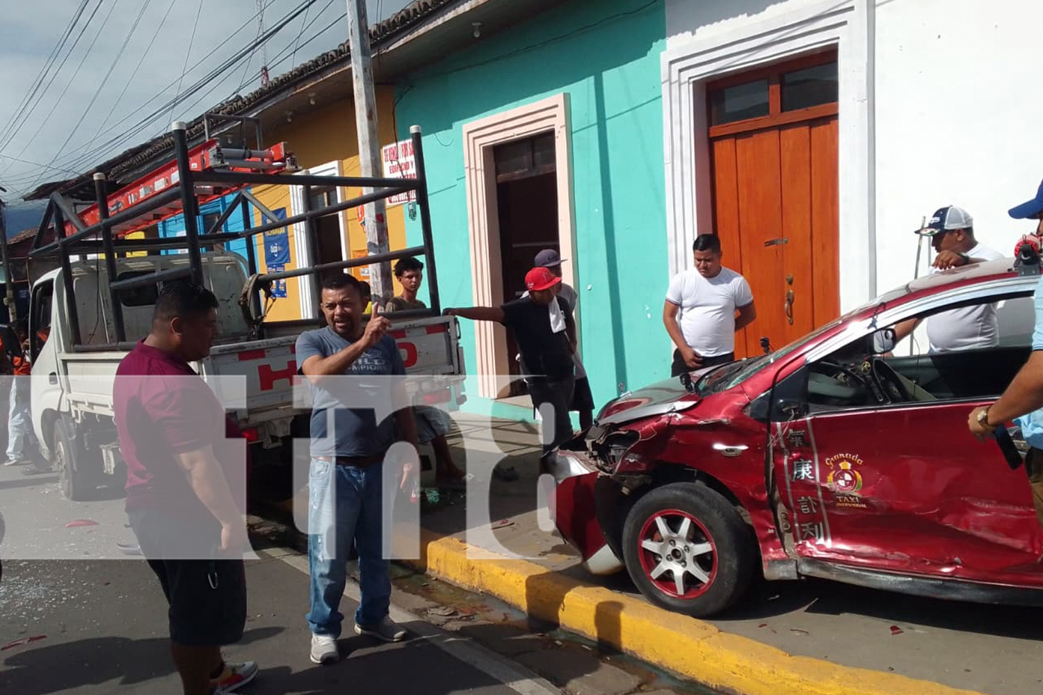 Producto de la colisión, el taxi rojo quedó sobre la acera, a pocos centímetros de meterse en los módulos para negocios que son rentados en la casa esquinera donde fue a parar.
