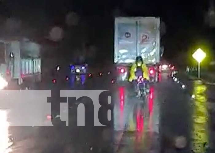 Este sujeto que temerariamente conduce bajo la lluvia, se tambalea una y otra vez mientras va detrás de un camión. Posteriormente se cruza al carril contrario y sin importar que va contra la vía continúa su marcha.