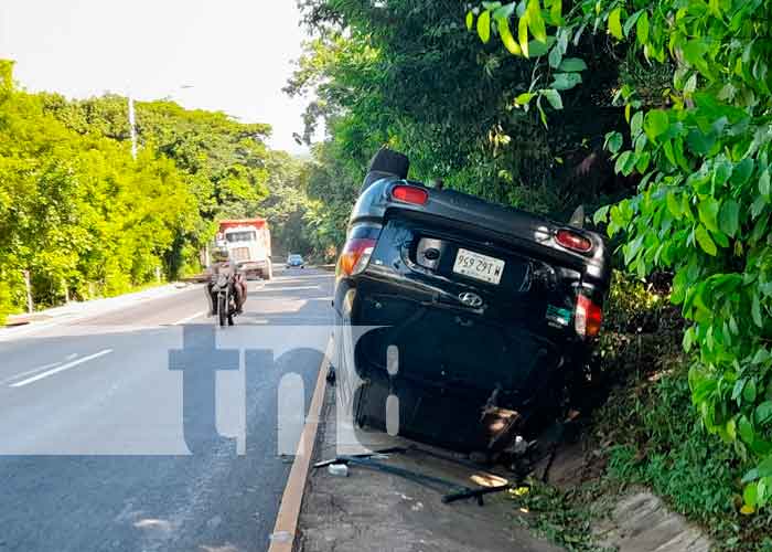 El carro Hyundai color negro placa M 162 656 quedó volteado con dirección a Managua.