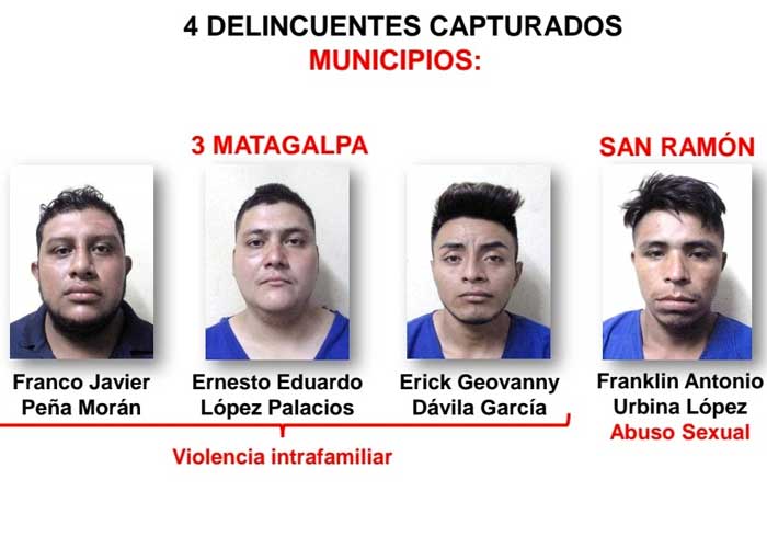 3 de los detenidos son del departamento de Matagalpa y a estos los señalan del delito de violencia intrafamiliar. Franco Javier Peña Morán, Ernesto Eduardo López Palacios y Erick Geovanny Dávila García están detenidos; mientras que en el municipio de San Ramón, a Franklin Antonio Urbina López lo capturaron por el delito de abuso sexual.