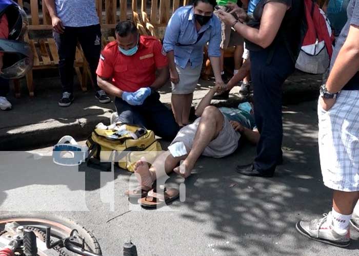 Con una posible fractura en su pierna derecha, resultó el motociclista Félix Fernando Espinoza Centeno; luego de colisionar este martes con otra motocicleta en el sector de La Caimana, del Mercado Oriental, en Managua.