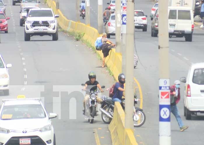 En ese mismo orden, pero en otro punto de Managua un motociclista decide aventajar por la izquierda una fila de vehículos, llevando el casco como sombrero, sin agregar el mínimo aprecio que tiene hacia la mujer que lo acompaña, quien no lleva el casco de seguridad.