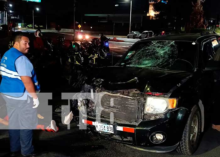 Dos ocupantes de una motocicleta, identificados como Celeste González Manzanares, de 22 años, y Winston Jerónimo Dormes Borge, de 28 años; resultaron con graves lesiones en diversas partes del cuerpo después de presuntamente desobedecer la luz roja del semáforo en la Plaza de Las Victorias en Managua; y ser impactados por una camioneta.