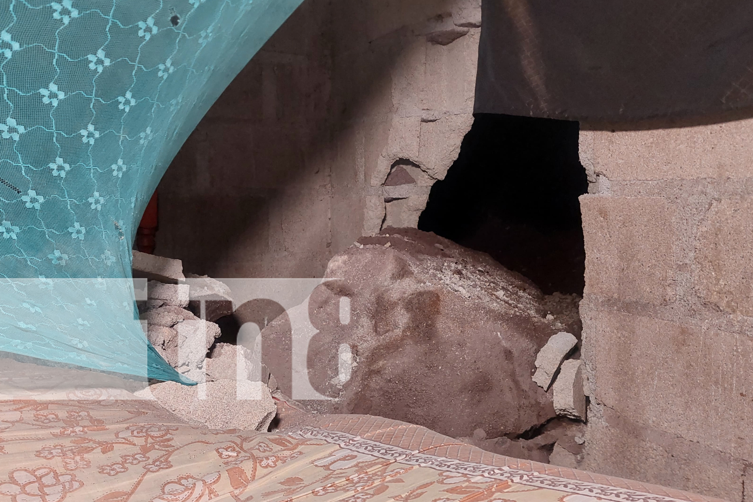 La humilde vivienda de la señora Claribel Gaitán Díaz, originaria de la comunidad San Juan de Somoto en Madriz; sufrió grandes daños en una de las paredes de la misma, luego que se desprendiera una enorme piedra provocando un agujero en la parte trasera de su casa.