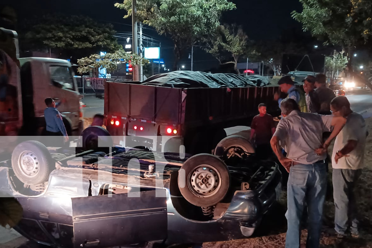 Conductores y personas que transitaban cerca de los semáforos de la Quinta Nina, Managua fueron testigo de un sorprendente accidente de tránsito que se registró la noche de este lunes, cuando un vehículo terminó volcado; el incidente ocurrió cuando el conductor, un señor de la tercera edad, perdió el control de su automóvil y se subió al bulevar, lo que provocó la volcadura.