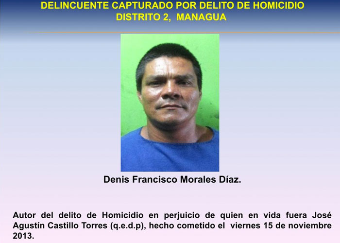 «Delincuente capturado por delito de homicidio en el Distrito II, Managua. Autor del delito de homicidio en perjuicio de José Agustín Castillo Torres. El delito lo cometió el viernes 15 de noviembre 2013»; dijo el comisionado general Sergio Gutiérrez, II jefe de la policía en Managua. También argumenta que junto a este caso fueron esclarecidos 4 delitos de homicidio.